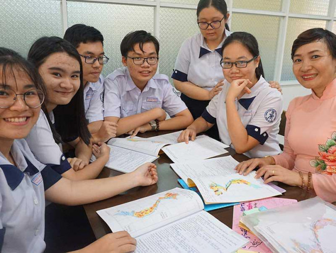 Học địa lý qua trò chơi là phương pháp được cô Võ Thị Kim Hiệp, Trường THPT chuyên Trần Đại Nghĩa, quận 1, TP.HCM, áp dụng để học trò thích thú với tiết học. Sự kiện: Giáo dục Quá trình đổi mới căn bản, toàn diện giáo dục đang đòi hỏi giáo viên không ngừng sáng tạo để “dụ dỗ” học sinh tiếp cận kỹ năng, kiến thức. Không ít thầy cô đã có những chuyển biến tích cực, mang lại thích thú cho học sinh. Tiết ôn tập địa lý để chuẩn bị kiểm tra 1 tiết của lớp 12 chuyên toán Trường THPT chuyên Trần Đại Nghĩa diễn ra thật khác lạ. Thay vì học trò ngồi ôn lại các kiến thức đã học thì cả lớp được tham gia một trò chơi mang tên “Ai là người thắng cuộc?”. Lớp học được chia thành năm nhóm. Mỗi nhóm sẽ được giáo viên phát một bộ phiếu kiến thức liên quan đến những nội dung đã học. Các nhóm sẽ chơi ghép các mẫu phiếu có kiến thức địa lý với nhau sao cho đúng. Và đặc biệt nhóm nào chơi đúng nhất, nhanh nhất thì được cộng điểm. Không khí lớp học trở nên sôi nổi hẳn lên. Các em bàn luận, trao đổi hăng say. Tiết học cứ thế trôi qua nhẹ nhàng, tràn ngập tiếng cười. Vừa vui nhộn vừa thấm kiến thức Phương Linh, một học sinh của lớp này, hào hứng kể: “Cô Hiệp áp dụng nhiều phương pháp mới trong tiết dạy. Nhờ vậy, tiết học bớt nhàm chán và trở nên vui nhộn. Qua trò chơi, kiến thức địa lý lại được khắc sâu hơn vì chỉ có nhớ nội dung, tụi em mới tìm được mối liên hệ giữa các phiếu với nhau”. Kim Ngân, một nữ sinh cùng lớp, cho biết thêm: “Cô còn cho tụi em ôn tập bài theo phương pháp kỹ thuật phòng tranh. Trong chương trình lớp 12 có những kiến thức về ngập lụt, hạn hán, bão và lũ quét. Cô sẽ chia lớp thành bốn nhóm. Bốn nhóm sẽ tóm tắt nội dung trên bằng sơ đồ tư duy giống như một bức tranh. Bốn bức tranh được dán ở các vị trí khác nhau trong lớp. Sau đó, cô trộn bốn nhóm ban đầu thành bốn nhóm khác, trong đó các nhóm đều bao gồm thành viên của các nhóm. Các bạn sẽ lần lượt đi tham quan bốn bức tranh. Tới bức tranh nào, các thành viên đã thực hiện sẽ đứng ra thuyết trình”. Trong khi đó, em Hữu Quý lại nói: “Em thích nhất khi nhận được những lời phê có một không hai của cô khi làm bài kiểm tra”. Khi đó, cô Hiệp nhận xét bài kiểm tra của học sinh bằng tên những bài hát. “Có bạn vẽ bản đồ quên quần đảo Trường Sa, cô sẽ phê “Gần lắm Trường Sa ơi” và yêu cầu bạn phải đứng trước lớp hát bài này. Còn với những bạn đạt điểm tối đa, cô ghi nhận xét: “Tôi đang nghe Tổ quốc gọi tên mình bằng tiếng sóng Trường Sa, Hoàng Sa dội vào ghềnh đá” hay “Tổ quốc ơi ta đã nghe lời kêu gọi” hoặc “Tự hào Việt Nam”. Nhận những lời phê từ cô, dù điểm thấp nhưng sẽ không ai cảm thấy buồn mà lại có thêm động lực để cố gắng. Cô Võ Thị Kim Hiệp bên các học trò của mình. Ảnh: NGUYỄN QUYÊN Không quản vất vả để đổi mới Chia sẻ về mình, cô Hiệp cho biết những phương pháp trên được cô áp dụng để phát triển năng lực của học sinh. Cô nhận thấy việc học địa lý qua trò chơi trong các tiết ôn tập rất hiệu quả. “Phương pháp này tạo sự mới mẻ, hoạt động vui nhộn thu hút học trò, giảm tâm lý nhàm chán” - cô Hiệp nói. Không đổi mới thì khó đáp ứng học sinh Cô Hiệp cho biết nếu dạy theo cách cũ, giáo viên sẽ khỏe hơn. Còn một khi đã chấp nhận đổi mới, giáo viên sẽ cực gấp nhiều lần. “Nhưng hiện nay nếu giáo viên không chịu đổi mới sẽ khó có thể đáp ứng được nhu cầu của học sinh” - cô Hiệp nói. Còn việc áp dụng phương pháp kỹ thuật phòng tranh theo cô Hiệp là để rèn luyện kỹ năng thuyết trình trước đám đông cho tất cả học sinh trong lớp. “Để thực hiện phương pháp này, giáo viên phải năng động và biết quản lý lớp. Đối với những lớp có sĩ số quá đông thay vì học trò di chuyển theo các bức tranh, hãy để các em ngồi tại chỗ và cho bức tranh di chuyển” - cô Hiệp cho biết. Đề cập đến những lời phê trong các bài kiểm tra, cô Hiệp khẳng định: “Những lời nhận xét rất quan trọng. Nếu giáo viên phê thiếu cẩn trọng sẽ khiến trò tổn thương. Vì thế, tôi nghĩ phải làm sao dù điểm thấp hay cao nhưng khi đọc lời phê, các em sẽ không buồn và thấy được khích lệ”. “Để nghĩ ra những phương pháp trên, bản thân tôi phải học hỏi từ đồng nghiệp. Tôi cũng đọc nhiều phương pháp từ nước ngoài. Tuy nhiên, trong quá trình đó, tôi cũng chọn lọc những phương pháp phù hợp. Nó có thể áp dụng cho nhiều lớp, lại có thể sử dụng nhiều năm và không mất nhiều chi phí” - cô Hiệp nói. Cô Hiệp thừa nhận đổi mới là tốt nhưng cũng phải có điểm dừng để nhìn lại. “Tùy nội dung, tôi mới tổ chức trò chơi. Tùy theo bài học, tôi sẽ áp dụng phương pháp phù hợp” - cô Hiệp cho hay. Trước câu hỏi điều gì khiến cô hạnh phúc